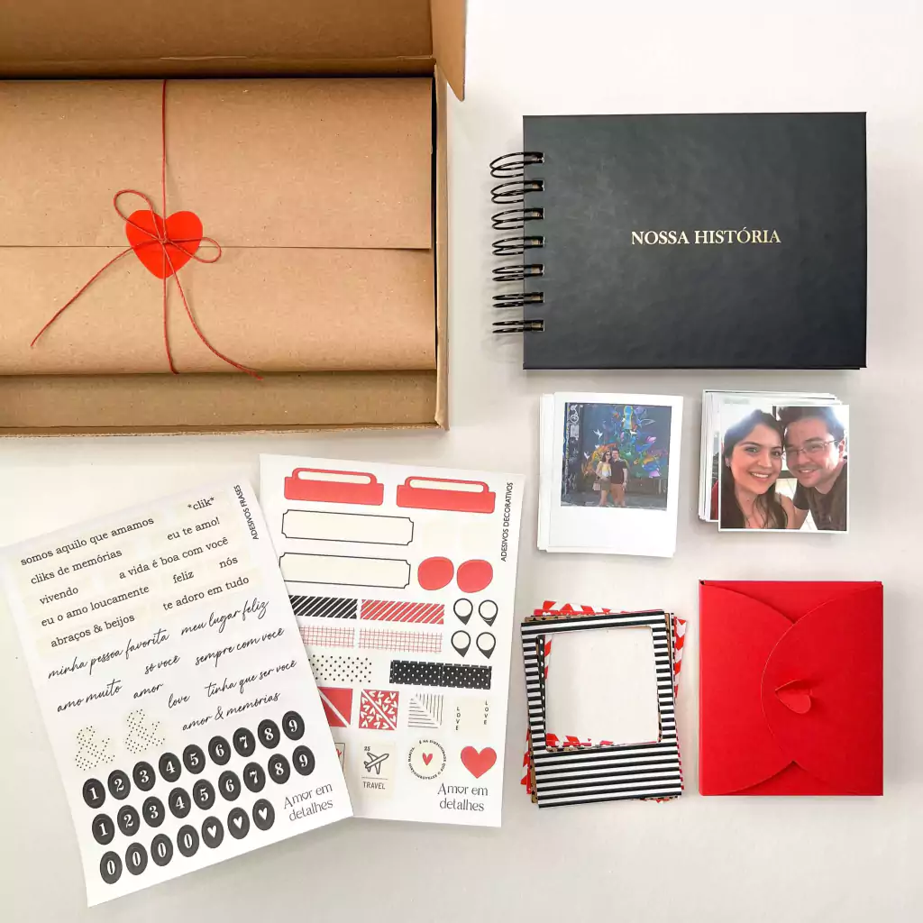 Para registrar a história de amor de uma forma divertida e criativa. Esse kit foi pensando em você, que deseja criar seu álbum de memórias, seja para presentear ou para você guardar de recordação. Deixe o sentimento fluir, personalize da forma que reflita a personalidade de seu relacionamento. Presentes criativos e personalizados, sempre serão inesquecíveis.