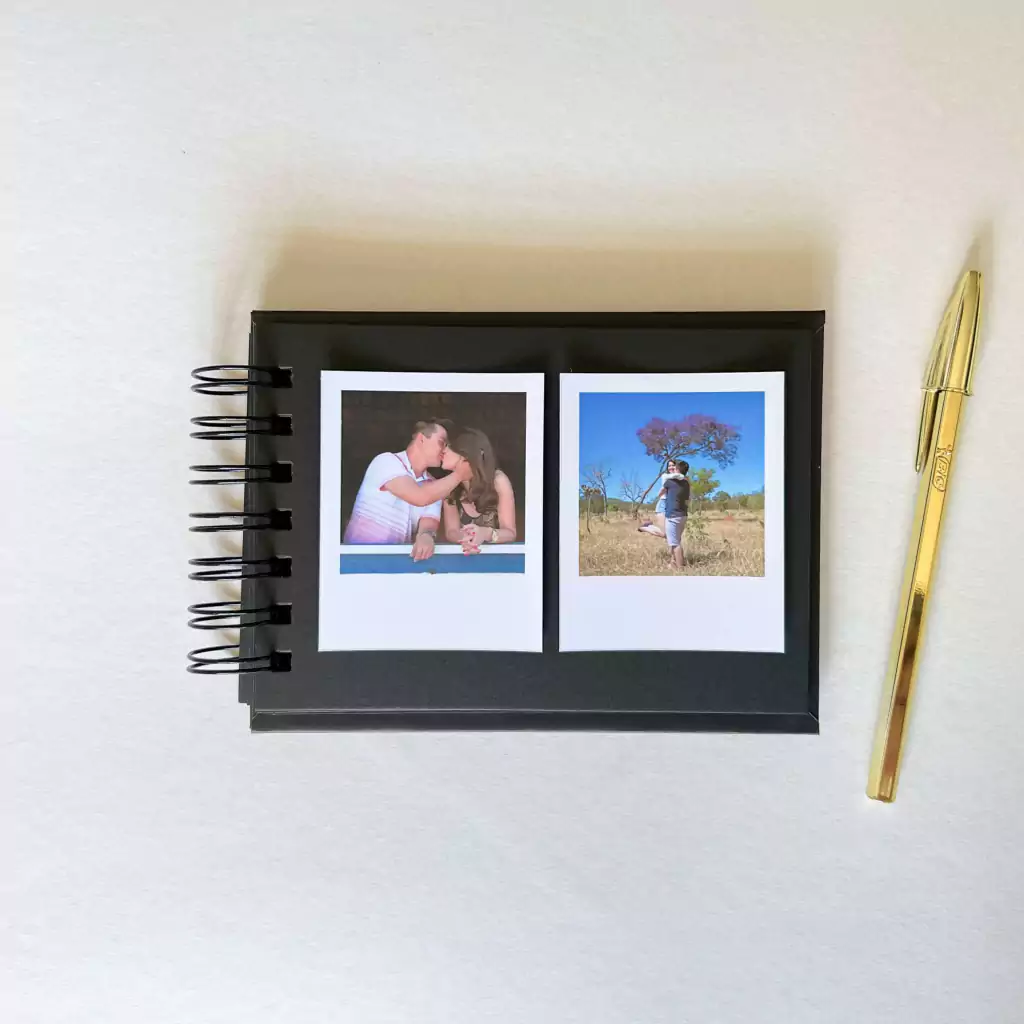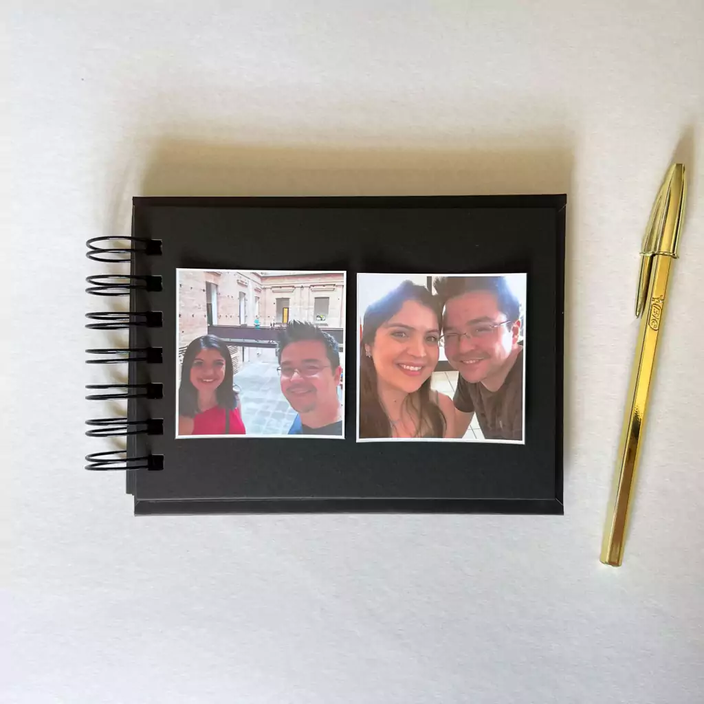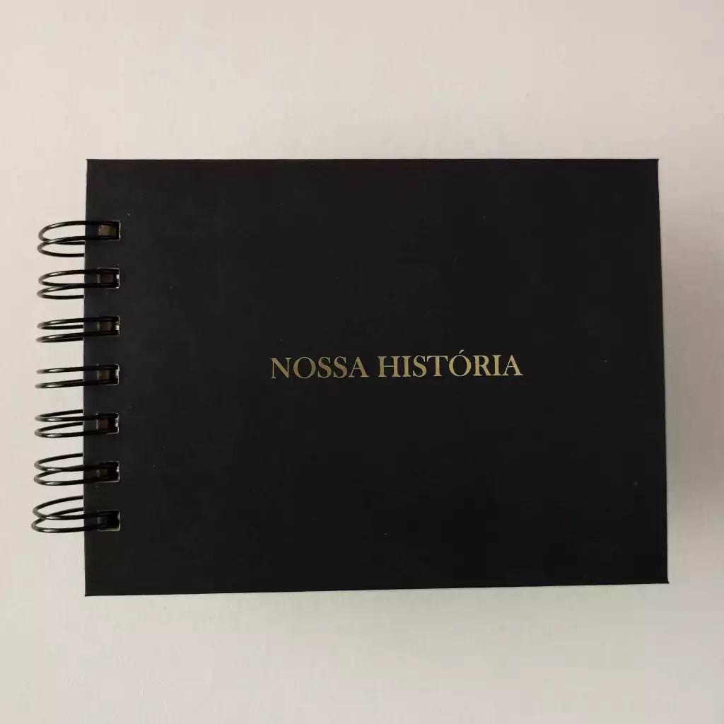 - 1 Álbum em capa dura tamanho 15,5x10cm com 30 folhas, laminação fosca com escrita em efeito metalizado (hot stamping);